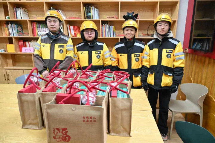 外卖员拿着“鹤”礼,送给辖区困难家庭